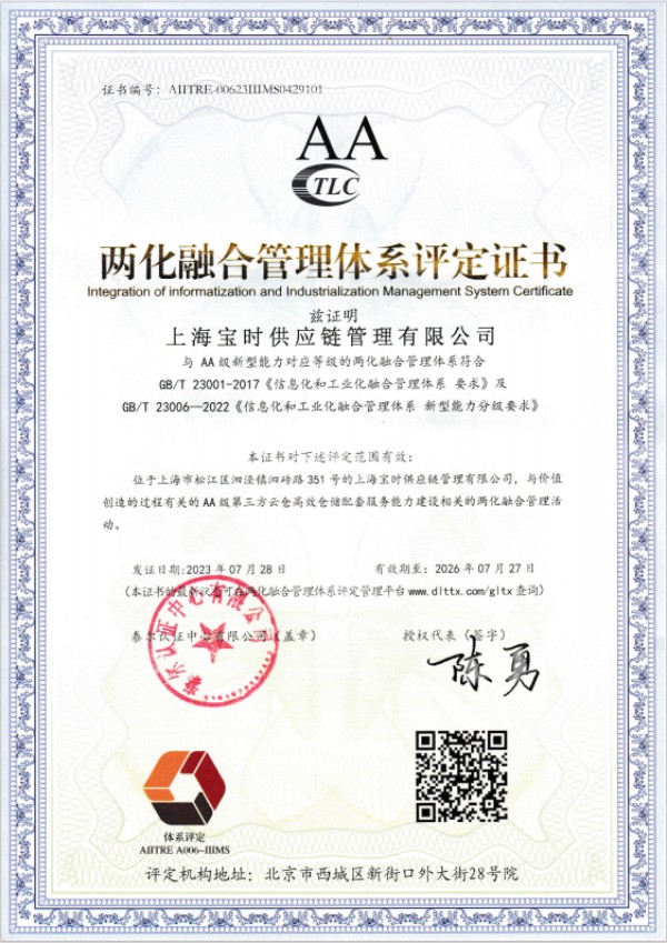 泰州两化融合管理体系AA评定证书